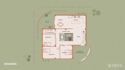 El centro de la comunidad es una casa comunal, diseñada para reunir y fortalecer lazos familiares, sirviendo como núcleo alrededor del cual se articulan espacios comunales. También se han contemplado elementos paisajísticos y urbanísticos que no solo embellecen el entorno, sino que mejoran el microclima y la sostenibilidad del área. Con MEYA, proponemos una nueva forma de vida para sus habitantes, respetando sus raíces y brindándoles soluciones dignas y sostenibles.